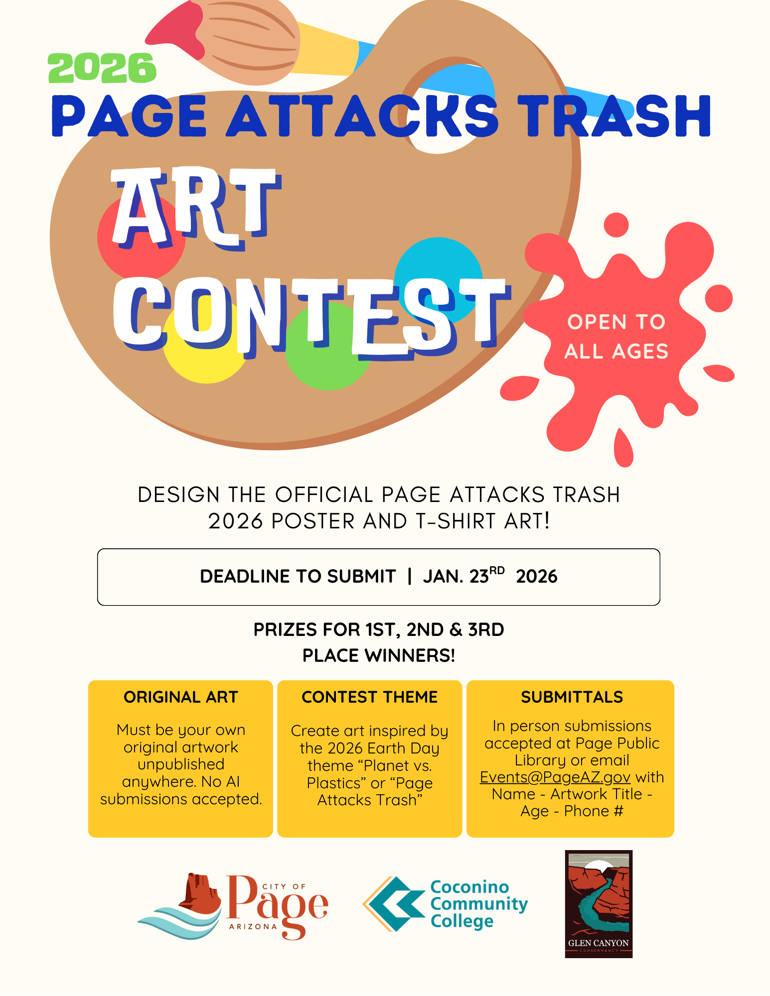 Let your creativity shine and be part of Page’s community wide effort to keep our city beautiful! The 2026 Page Attacks Trash is scheduled for Saturday, April 18.