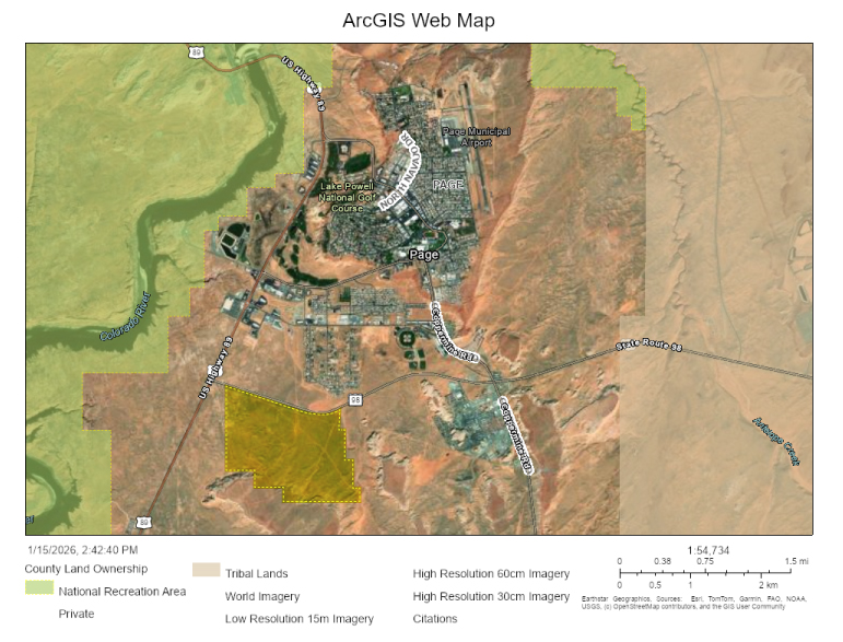 The potential project area is located entirely within the City of Page’s municipal boundaries and jurisdiction. Decisions related to Ordinance 744-25 and the land sale agreement fall under the authority of the City of Page. No separate governmental approvals or consultations outside the City’s jurisdiction were required as part of that action.